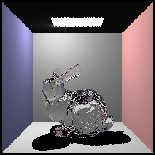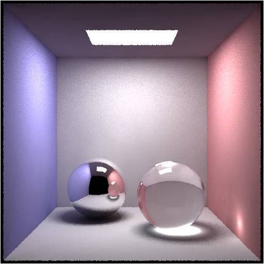 Our final shot of the Cornell box scene, combining direct illumination, indirect illumination from the global map using final gathering and irradiance caching, indirect illumination from the caustic map, and specular reflection/refraction using ray tracing.